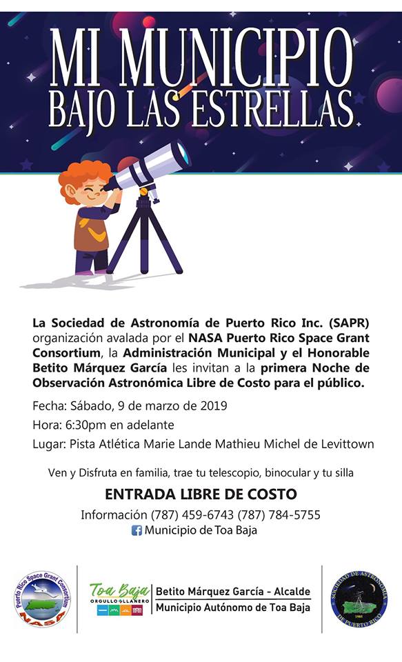 - Sociedad de Astronomía de Puerto Rico -"Mi Municipio Bajo las Estrellas" March 9, 2019, 6:30pm Place:Pista Atlética Marie Lande Mathieu, Levittown.