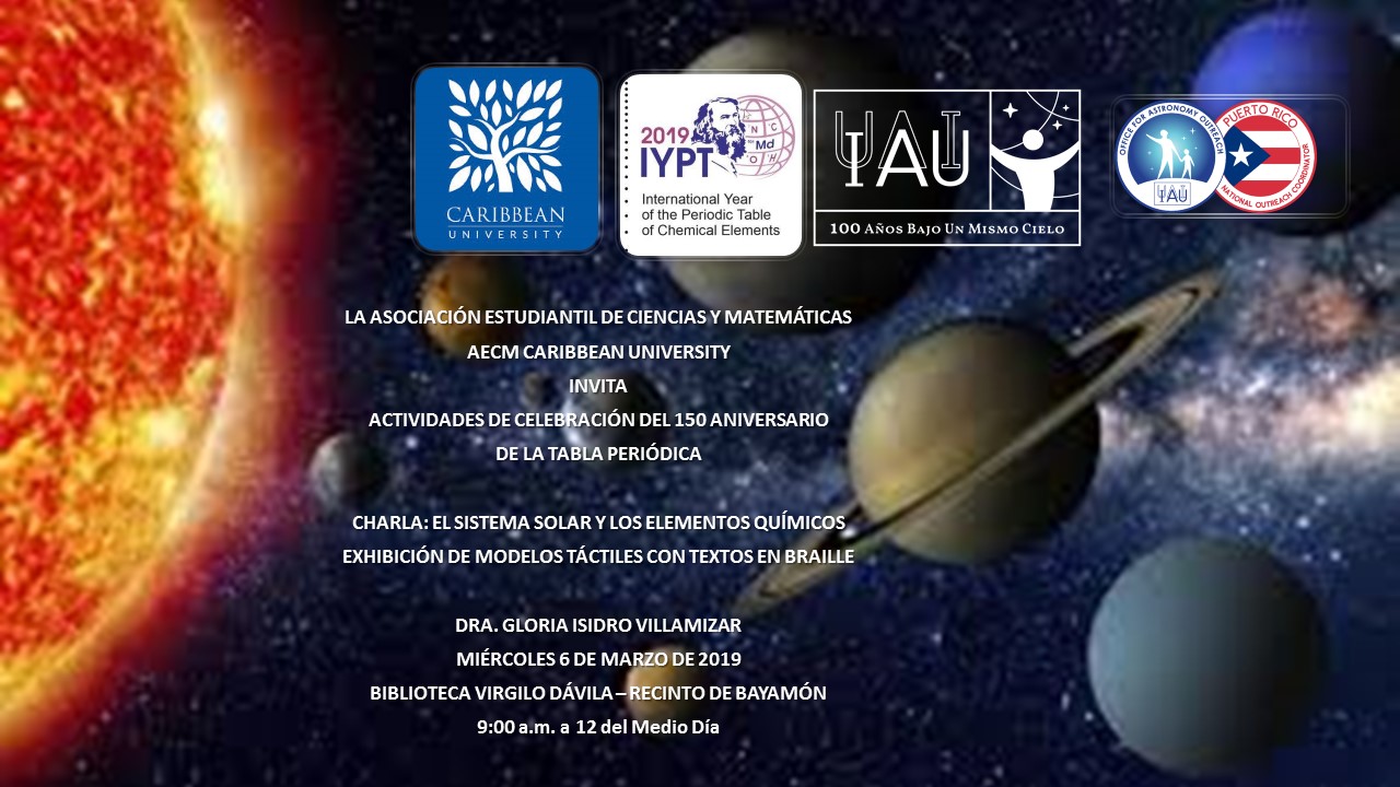 - Talk:"El Sistema Solar y los Elementos Químicos" Dra. Gloria Isidro, Biblioteca Virgilio Dávila, Caribbean University, Bayamón, 9:00 - 12m 6 de marzo del 2019