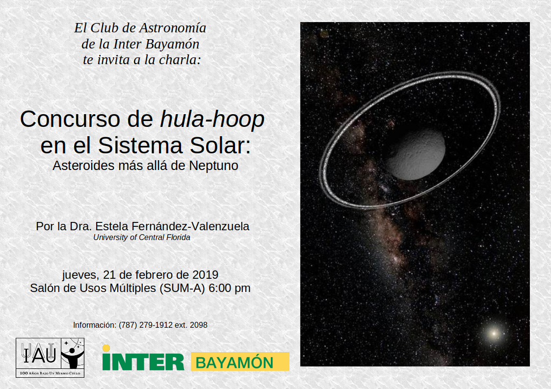 - Astronomy Talk: "Concurso de Hula-Hoop en el Sistema Solar: Asteroides Más Allá de Neptuno" by Dr. Estela Fernández Valenzuela from University of Central Florida (Salón de Usos Múltiples (SUM-A), Interamerican University-Bayamón, Thursday February 21, 2019 at 6:00pm) Poster